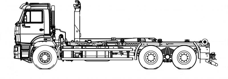 Собственный гидравлический механизм поднимает с пола загруженный кузов, подтягивает его к кабине и фиксирует на базовом шасси.