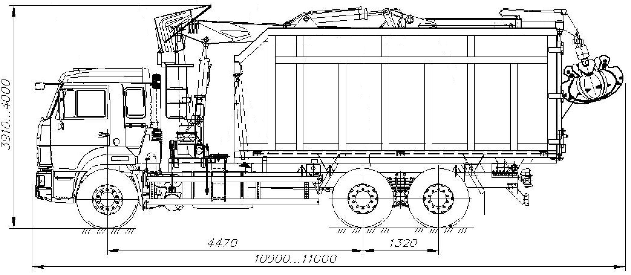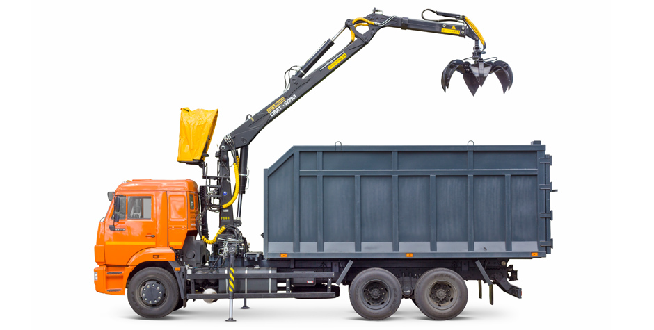 Автомобиль оснащен краноманипуляторной установкой ОМТ-97М с греферным шестилепестковым захватом и самосвальной платформой.